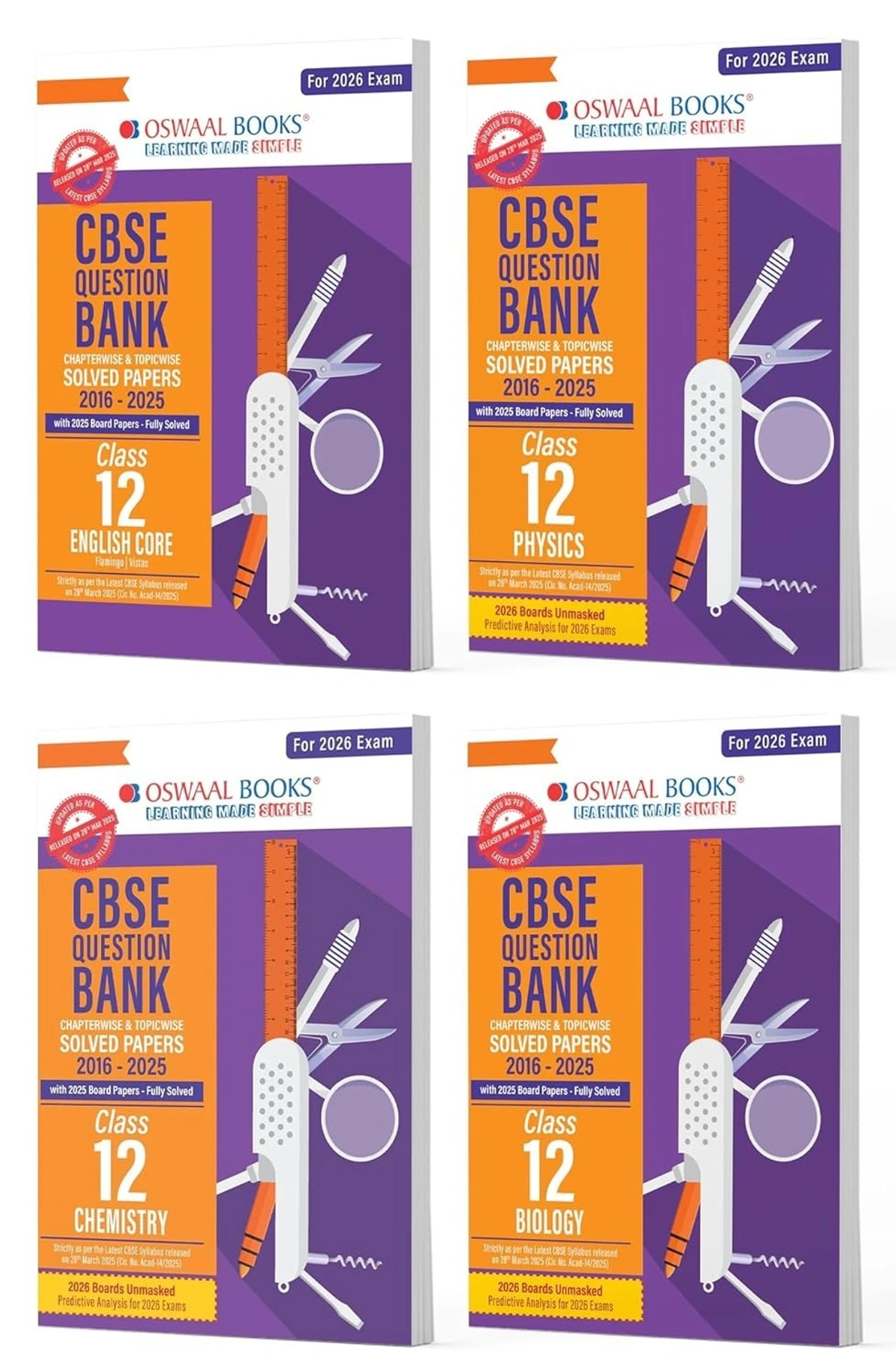 Prepare smarter and achieve academic success with the Oswaal PHYSICS, CHEMISTRY, BIOLOGY, ENGLISH Question Bank Chapterwise and Topicwise Solved Papers [2024-25]. Designed specifically for Class 12 students, this comprehensive set of 4 books offers everything you need to tackle your exams with confidence. Whether you’re aiming for top scores in competitive exams or excelling in board exams, this question bank is your ultimate study companion.
